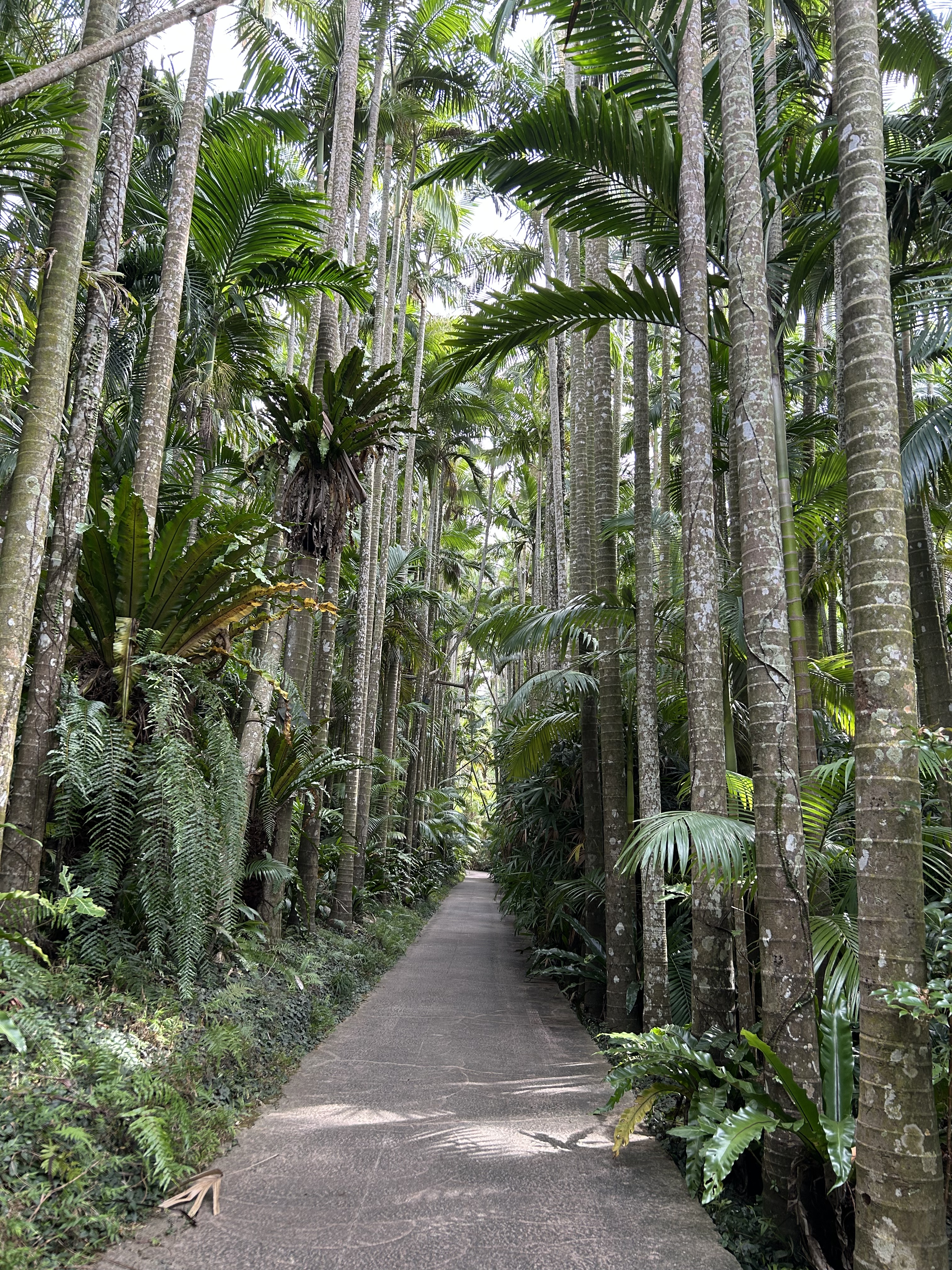 オーストラリア原産のユスラヤシが、沖縄の地で次世代を増やしながら、高さ 20m以上の並木道に成長しています!