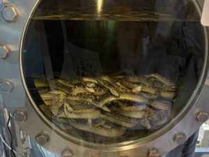 作られている場所の見学もできたのですが、150匹ものハブが泡盛に漬けられていました!